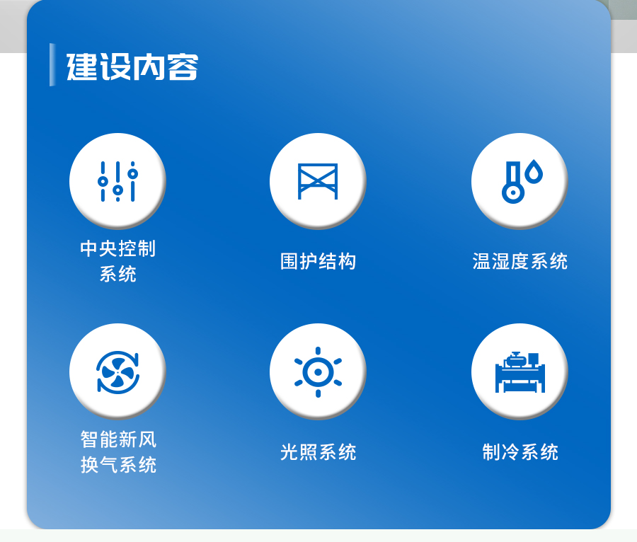 | 1 | 植物生长室 | 10~40 | 45~90 | 0~30000 | 通过室内环境模拟,研究植物生长全周期变化,根据用户栽培作物高度科学合理定制排布植物培养架或顶置光源 |